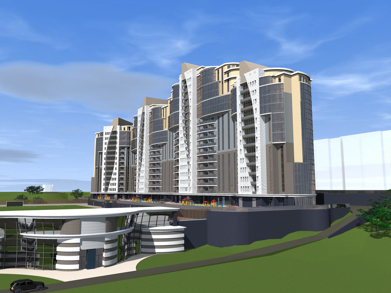 Масштабный проект жилого комплекса на участке со значительным перепадом рельефа включал в себя многоподъездный жилой дом, с офисными помещениями и паркингом расположенным как под жилым домом, так и под проектируемым стадионом.